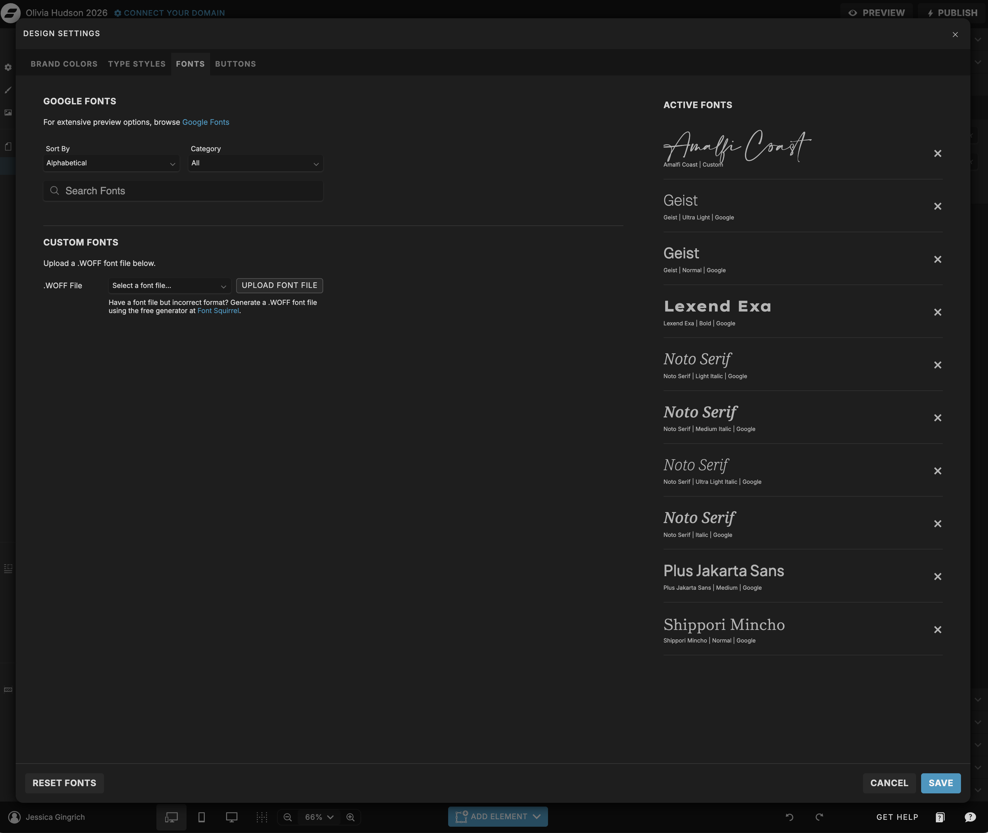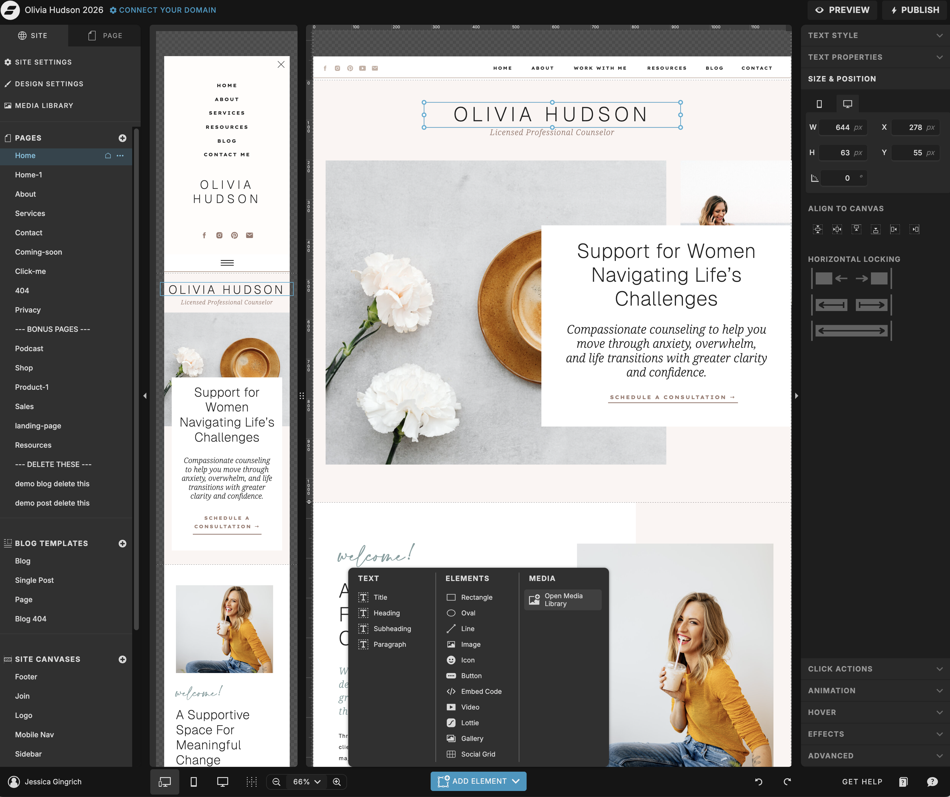 Fonts carry a lot of the personality of a design. Showit lets you connect Google Fonts for free, or upload a custom font if you have a licensed file. To change a font, click on any text element and update the font family in the right-hand panel. You can also use Showit’s global text styles to update heading and body fonts across the entire site at once — this is the most efficient approach.