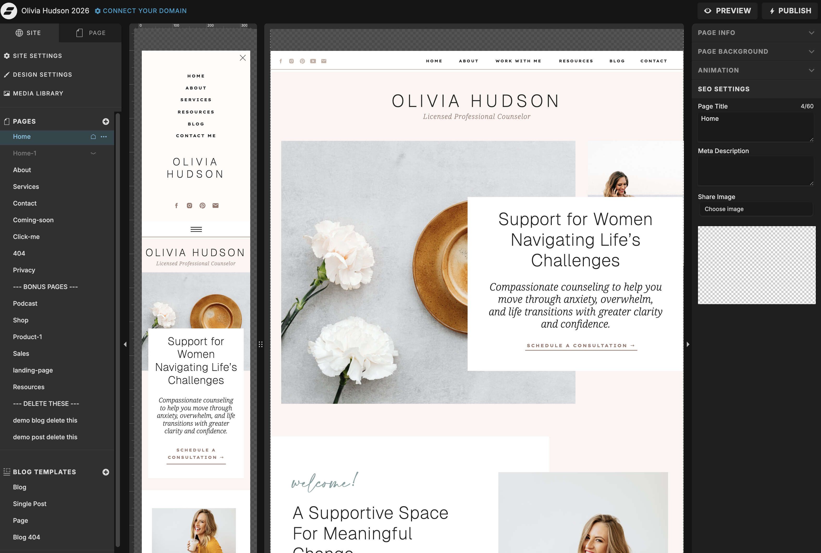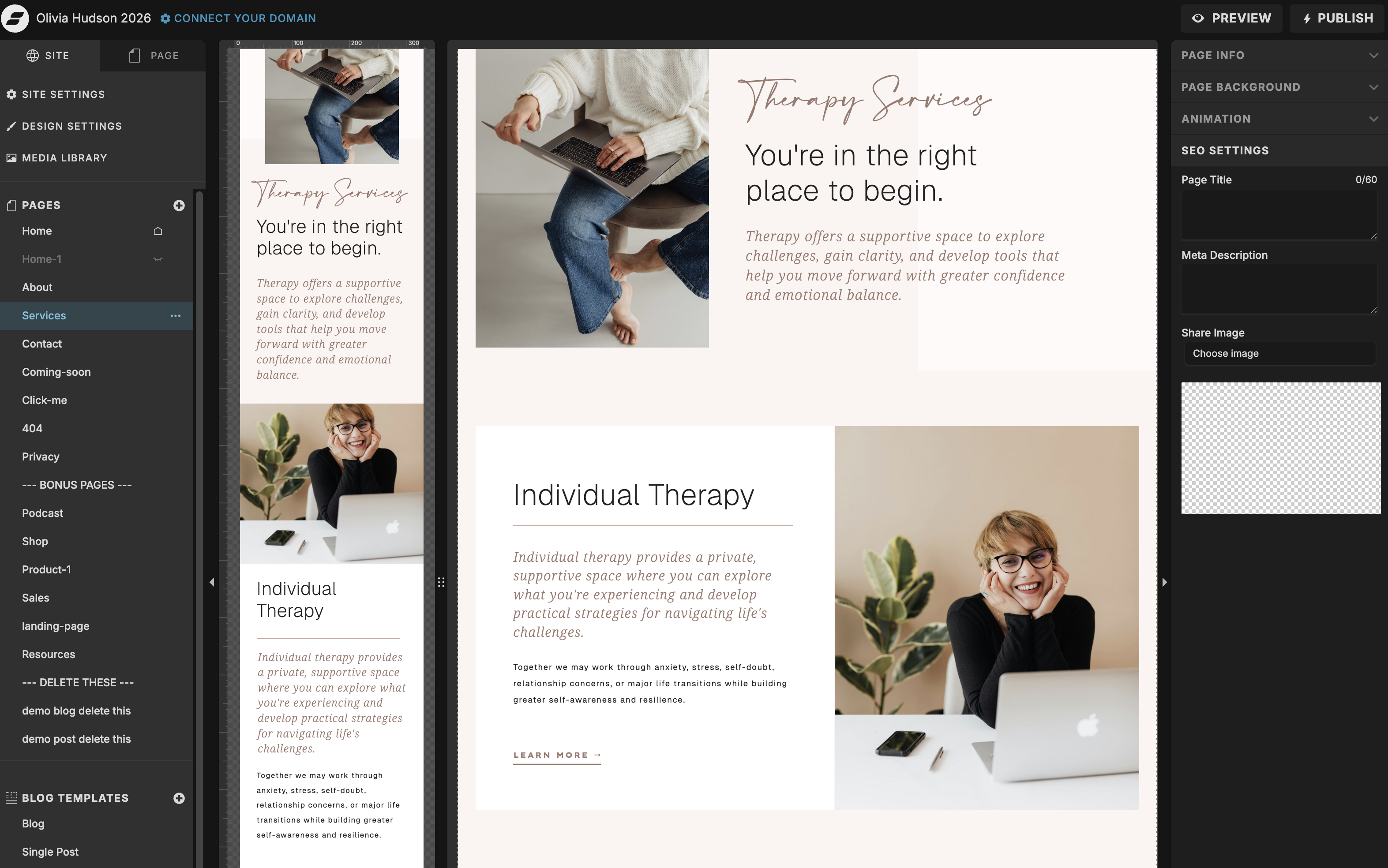 Once the homepage is in good shape, carry the same process through your other pages: update any remaining colors and fonts, swap in relevant images, and add your content. Your About, Services, and Contact pages will each take less time than the homepage since most of the visual work is already done.