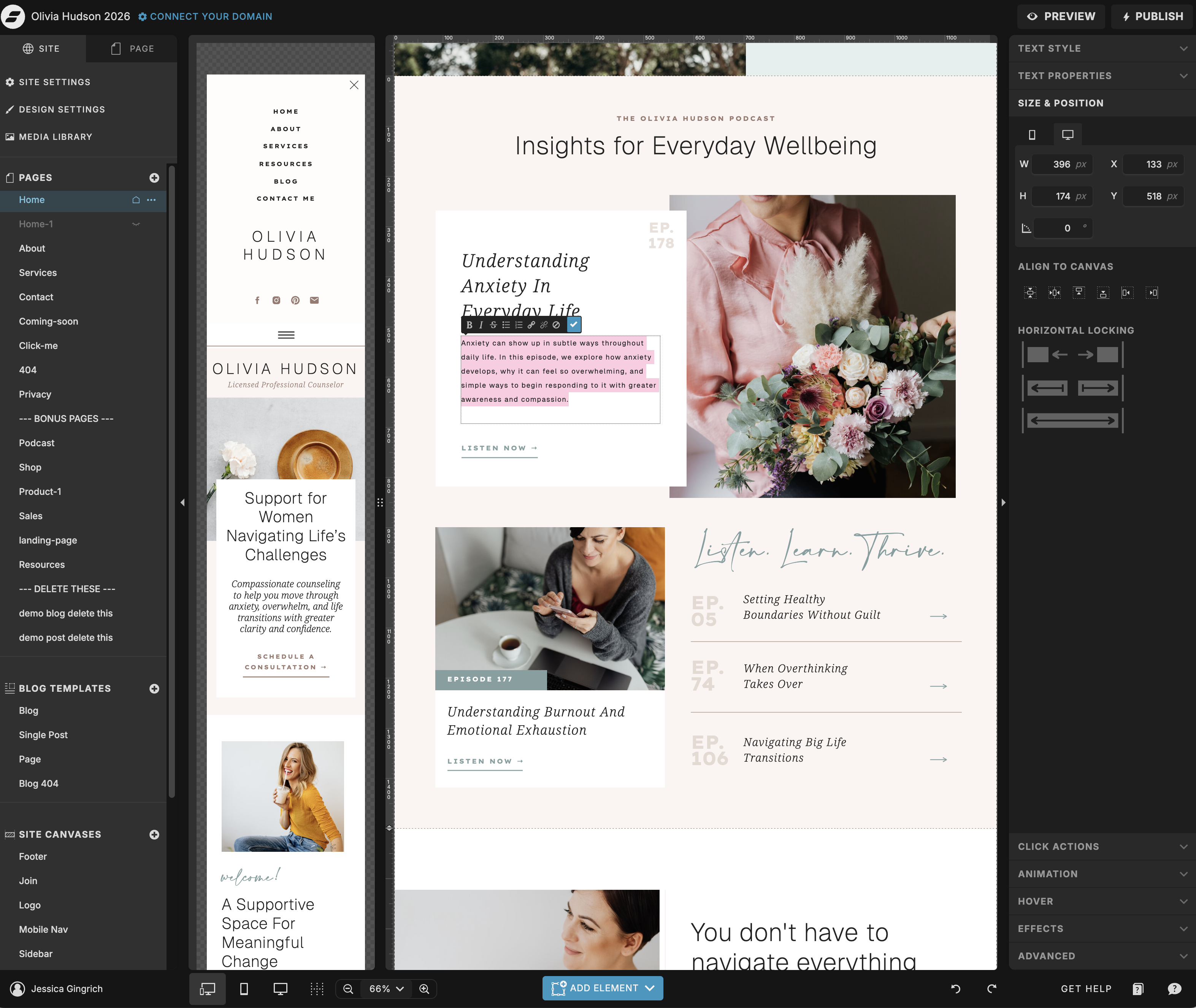This is one of the most commonly skipped steps — and one of the most important. Showit lets you design your mobile layout separately from desktop, which means you have full control over how your site looks on a phone. But it also means the mobile version needs its own attention.