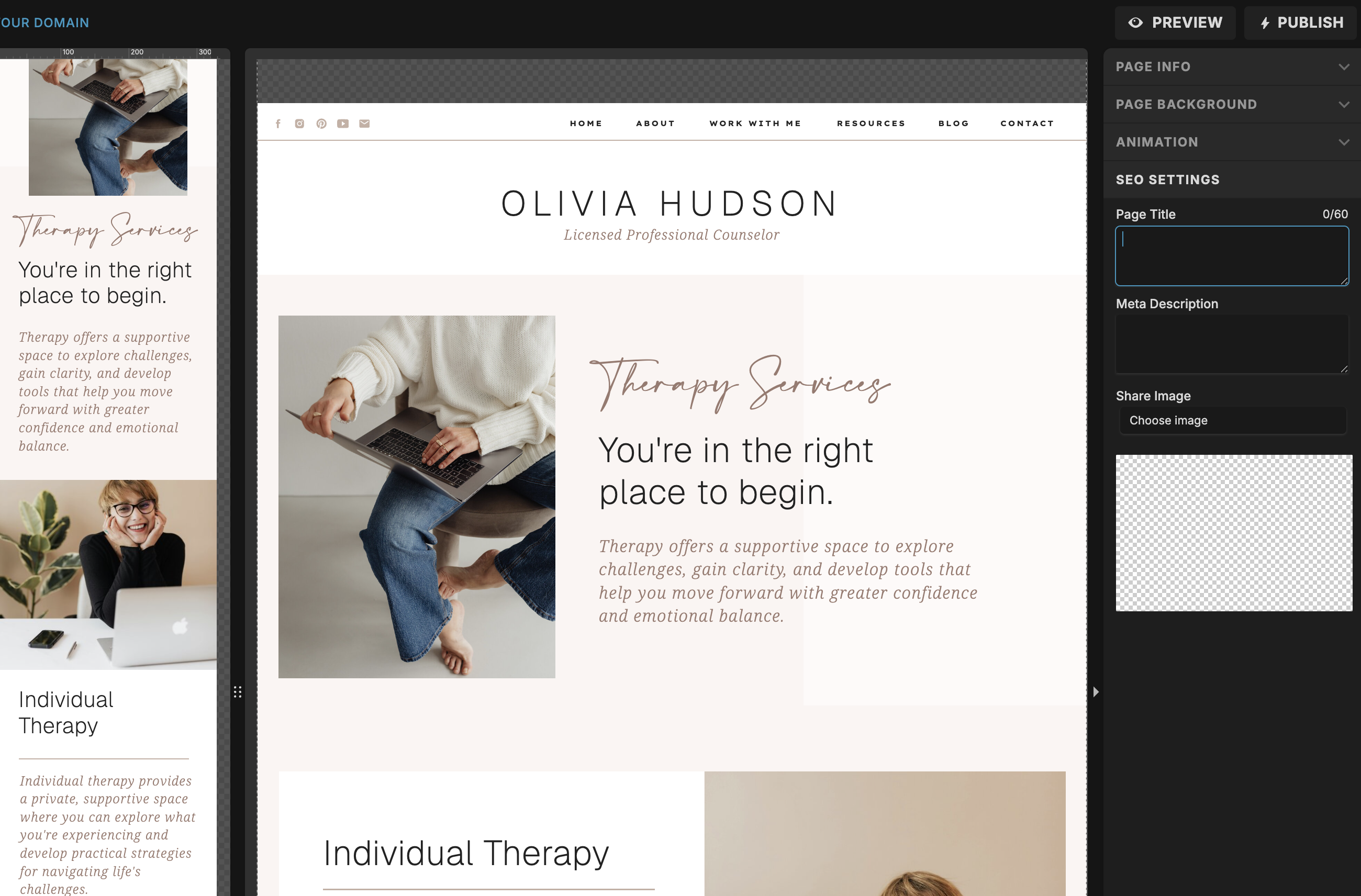 Before you publish, take a few minutes to fill in the basics. In Showit, you can add an SEO title and meta description for each page. These are what appear in Google search results, so they’re worth doing thoughtfully.