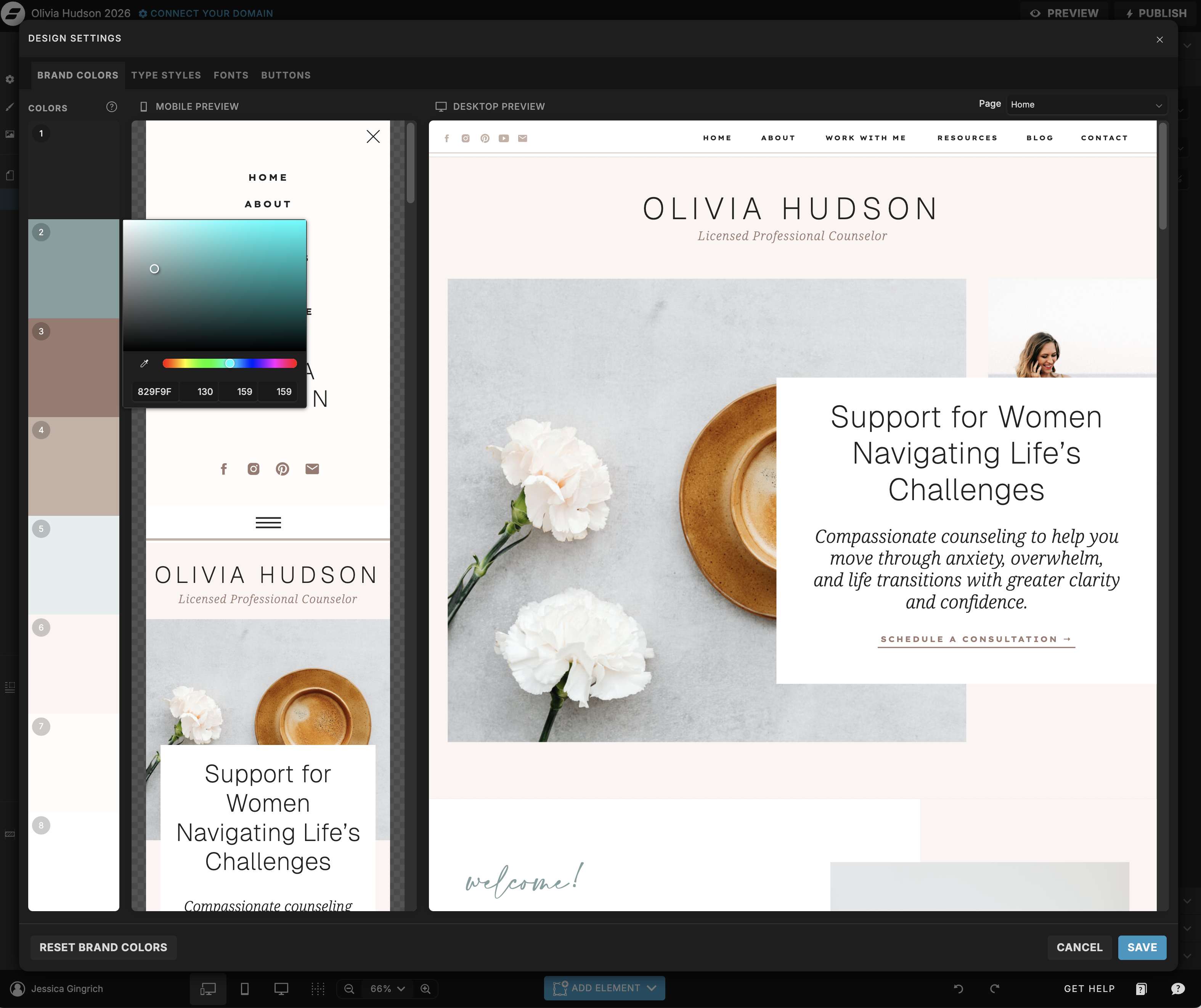 Click on any element to see its fill or text color in the right-hand panel. From there you can type in your hex code directly. Work through the homepage first, then carry those same colors through to your other pages.